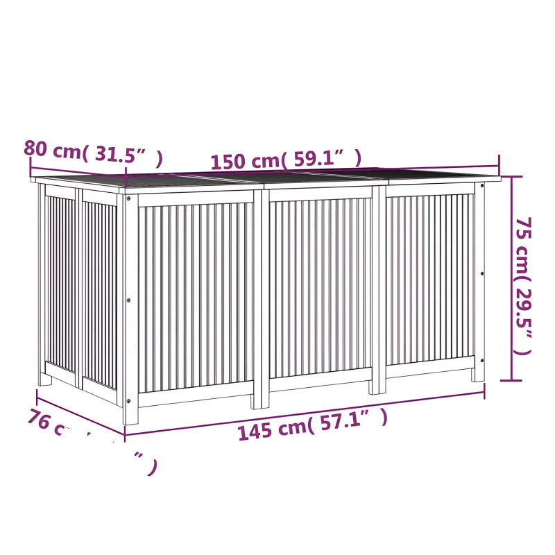 Mesurant 150 cm de large, 80 cm de profondeur et 75 cm de hauteur, ce coffre robuste offre un espace intérieur généreux de 141 cm par 72 cm par 62 cm pour ranger coussins, couvertures, jouets et outils de jardin. Son sac intérieur en polyéthylène résistant à l'eau protège vos affaires même dans des conditions humides.