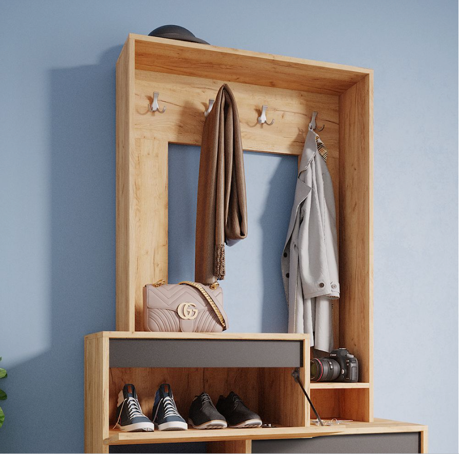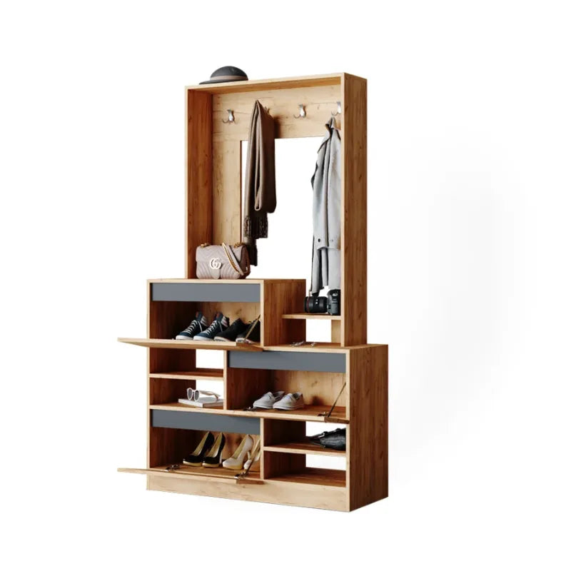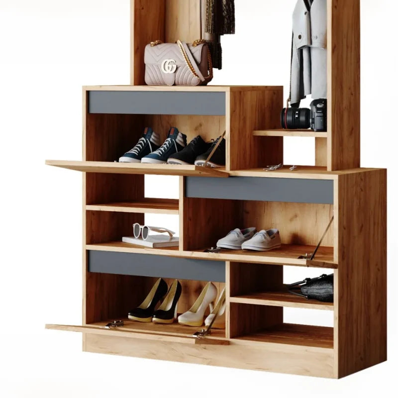 Doté de trois étagères à chaussures pliables et de quatre crochets robustes, il offre un espace suffisant pour ranger vos chaussures et manteaux de manière ordonnée. Fabriqué en panneau de particules de haute qualité avec un revêtement en résine mélaminée, ce meuble est conçu pour durer tout en étant facile à entretenir.