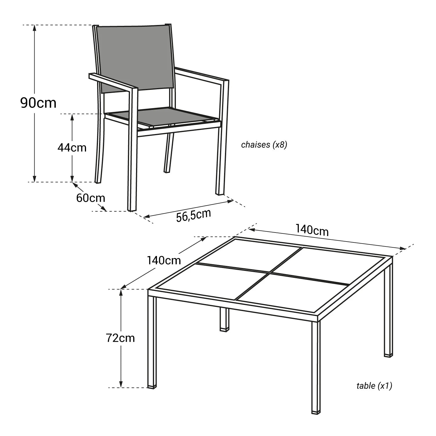 Découvrez le salon de jardin, un ensemble élégant et moderne de 8 places alliant la robustesse de l'aluminium gris et le confort du textilène noir. Parfait pour vos repas en plein air, ce salon offre une table carrée spacieuse et des chaises ergonomiques, résistantes aux intempéries et faciles à entretenir. Léger et empilable, il s’adapte parfaitement à tous les espaces extérieurs, du jardin à la terrasse, pour des moments conviviaux inoubliables sous le signe du style et de la durabilité.